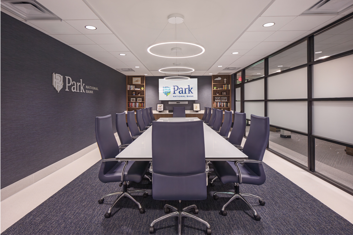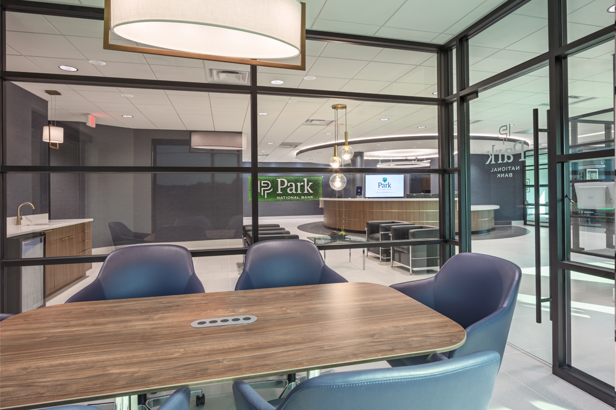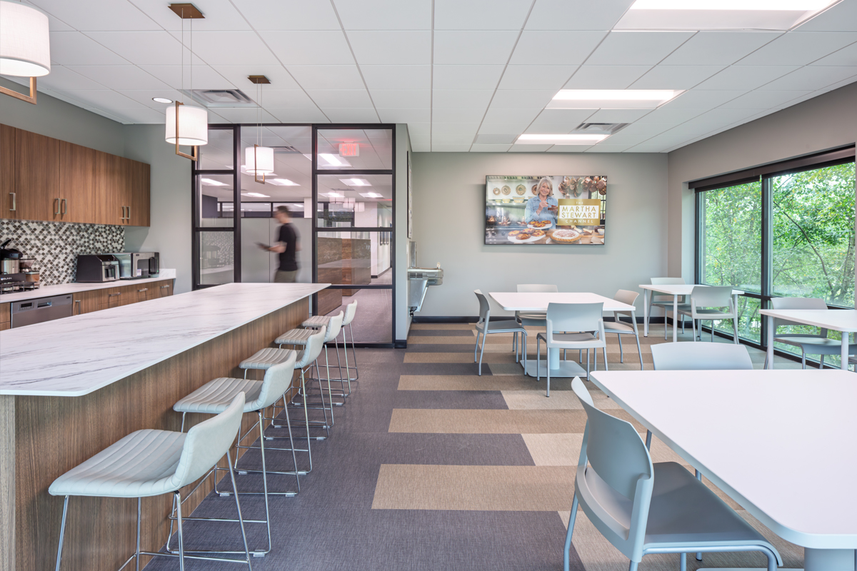 In collaboration with Greg Olympia and Mary Lee O’Bryan, DKN transformed a 10,400-square-foot office into a bright, welcoming space that reflects a modern brand identity. At the entry is a 20-foot diameter custom reception desk, clad in wood with gold reveals, anchored by a glowing ceiling feature above and coordinated floor tile inlays below. A moss wall showcasing the company’s logo provides a natural and memorable focal point. Glass storefront walls open the interior, bringing in natural light and connecting offices, meeting rooms, the break room, and open work areas. The result is a clean, contemporary environment that feels both professional and inviting.
